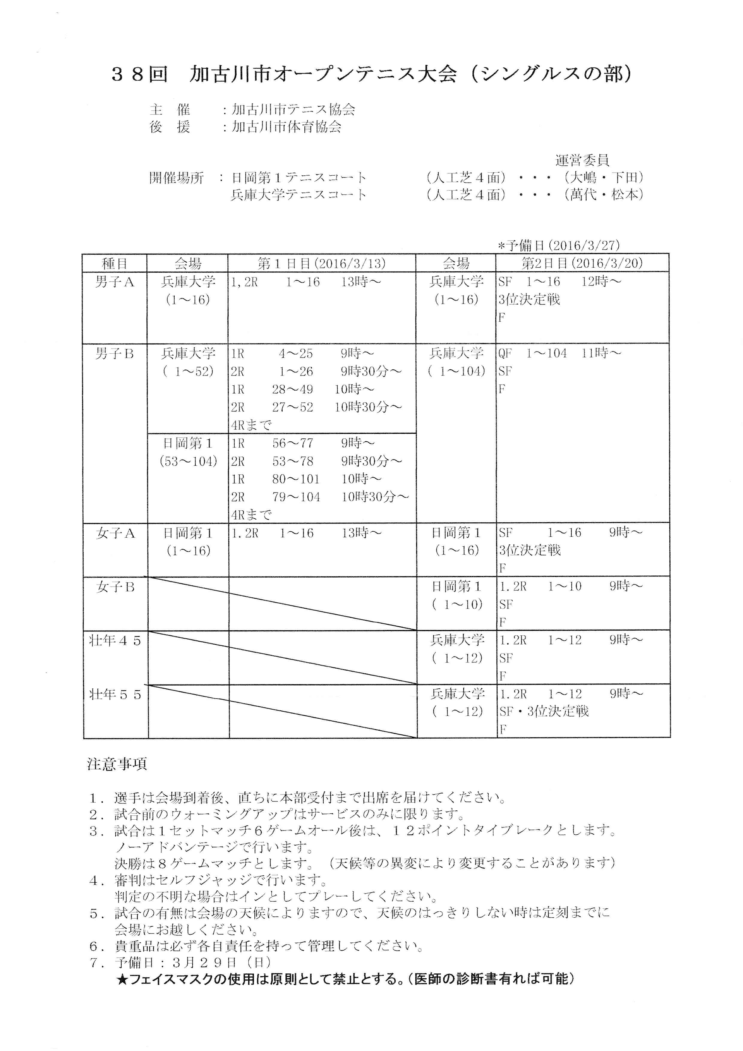 38回 加古川オープンテニス大会(シングルスの部)ドロー到着