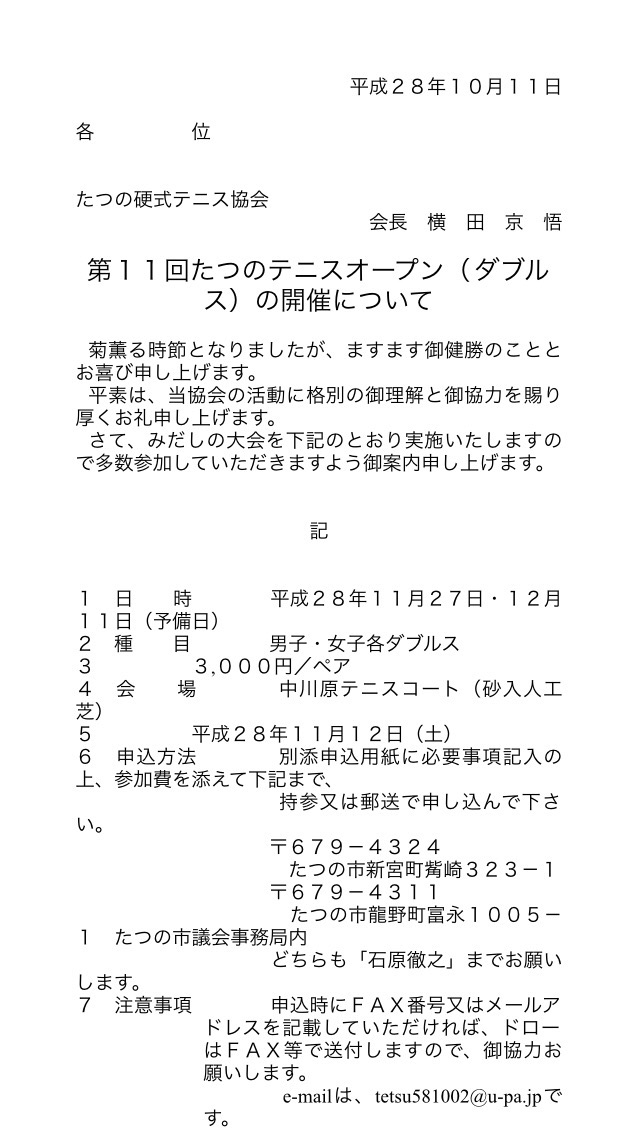 ホーム > お知らせ > 第11回 たつのテニスオープン(ダブルス)のお知らせ。 2016/10/14 参加希望者は、書き込むか連絡お願い致します。マシャップ締切11/9。 - お知らせ たつのテニスオープン