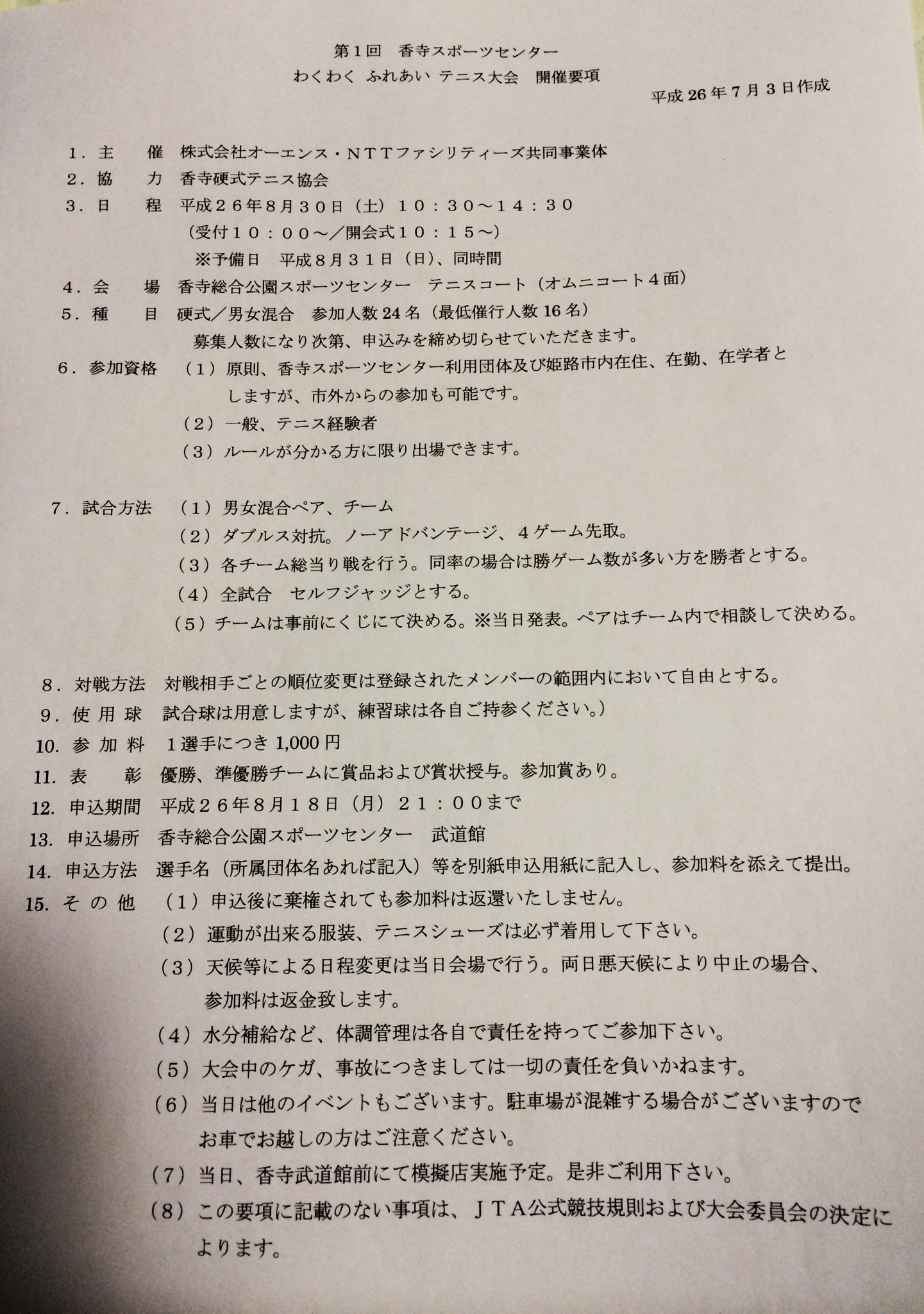 ホーム > Diary of a Leader > 第1回 香寺スポーツセンター わくわく ふれあい テニス大会のお知らせ 2014/08/08 先日、練習コートを押さえに行った時に、開催要項を頂きました! 楽しそうな大会なので、興味のある方は香寺武道館へ問い合わせしてみて下さい。 マシャップメンバーで、参加される方がおられましたら、私迄ご連絡お願い致します。 〆切 8/18(月) 21:00迄 - Diary of a Leader